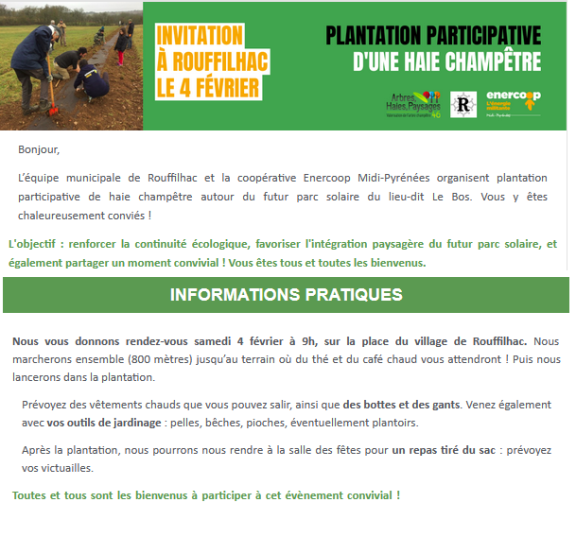 L’équipe municipale de Rouffilhac et la coopérative Enercoop Midi-Pyrénées organisent une plantation participative de haie champêtre autour du futur parc solaire du lieu-dit Le Bos. Vous y êtes chaleureusement conviés !