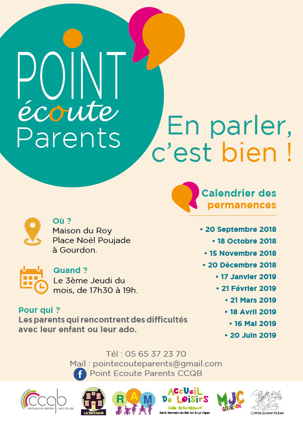 Afin de répondre aux attentes des parents, les acteurs de la petite enfance (RAM, Crèche Ecoute s’il joue), de l’ enfance et de la jeunesse du territoire (La Bicoque, les ALSH du Vigan et de Saint Germain du Bel Air, la MJC), se sont associés pour créer un Point Écoute Parents à Gourdon.