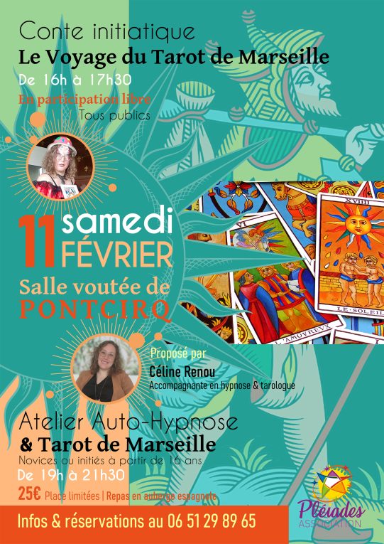 « Voyage avec le tarot de Marseille » & atelier auto-hypnose le samedi 11 Février 2023 Salle Voutée de Pontcirq (Salle du foyer rural) à partir de 16h pour le conte initiatique et 19h en soirée pour l’atelier auto-hypnose.