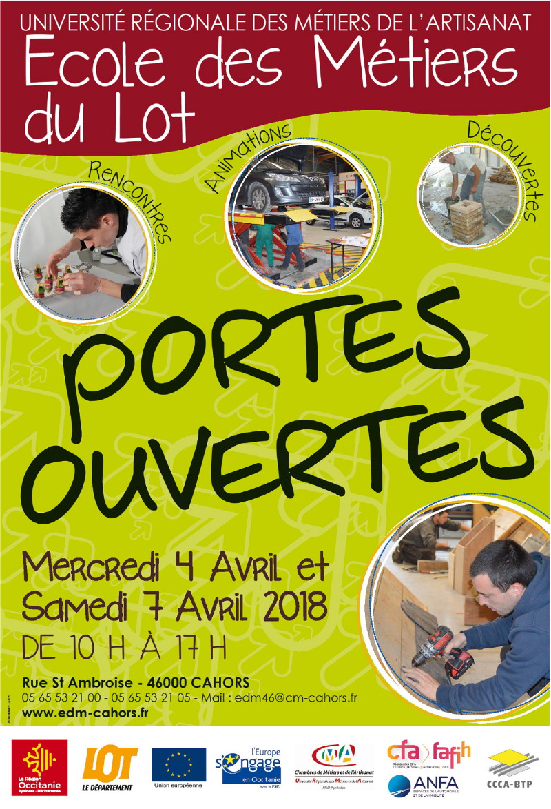 Les 4 et 7 avril, l’École des Métiers du Lot entend faire découvrir aux jeunes (principalement des élèves de 3e et des lycéens souhaitant se réorienter) et aux familles les possibilités d’orientations vers ses filières artisanales. Des animations seront également au programme de ces deux journées : le mercredi 4 avril, une animation délocalisée place François Mitterrand à Cahors mettra en avant la filière farine (boulangers et pâtissiers) ; le samedi 7 avril, un «Paintathlon» (autrement dit la fabrication de pains, viennoiseries, et décors qui seront notés par des professeurs et des visiteurs qui auront pour la circonstance, accès au laboratoire de fabrication des boulangers) sera organisé au sein de l’Ecole des Métiers, ainsi que des ateliers de dégustation, un show coiffure et une mise en valeur de produits de tous ordres.