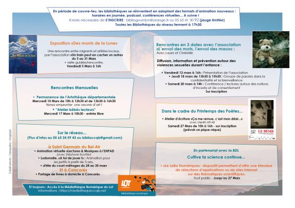 Programme de mars Publié le mercredi, 24 février 2021 par Bibliothèque Intercommunale Gourdon La Bibliothèque Quercy Bouriane vous présente « Des monts de la lune »