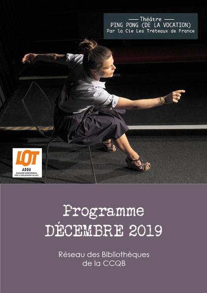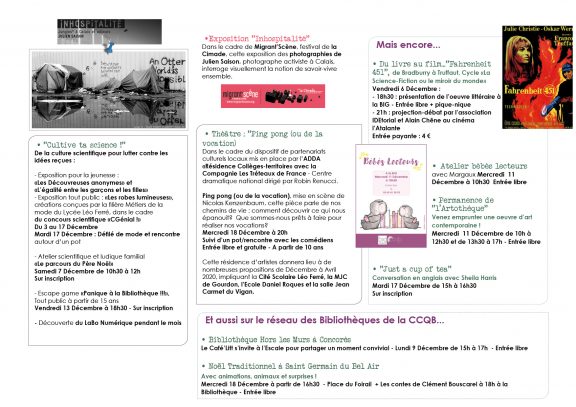 Programme des animations de la Bibliothèque de Gourdon Publié le vendredi, 6 décembre 2019vendredi, 6 décembre 2019 par Bibliothèque Intercommunale Gourdon Cliquez sur l’image pour l’agrandir Encore un mois riche en propositions culturelles à la BIG : théâtre avec les « Tréteaux de France », animations autour de la science, cinéma, bébés lecteurs, artothèque….