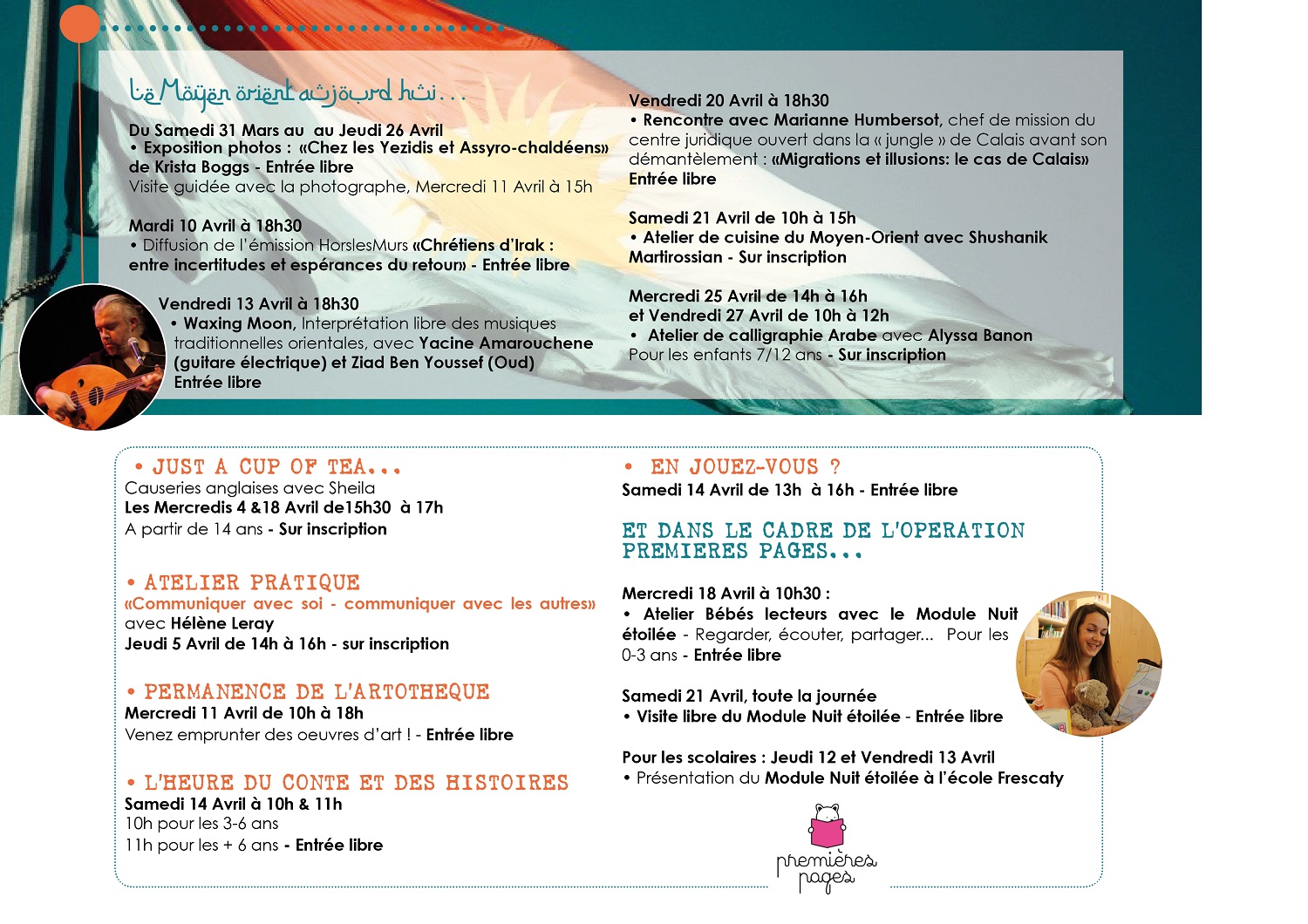 Programme des animations du mois d’avril de la Bibliothèque de Gourdon Publié le jeudi, 5 avril 2018samedi, 7 avril 2018 par Bibliothèque Intercommunale Gourdon Le Moyen Orient aujourd’hui…. et tout le mois d’avril à la BIG expo, concert, cuisine, contes, calligraphie …