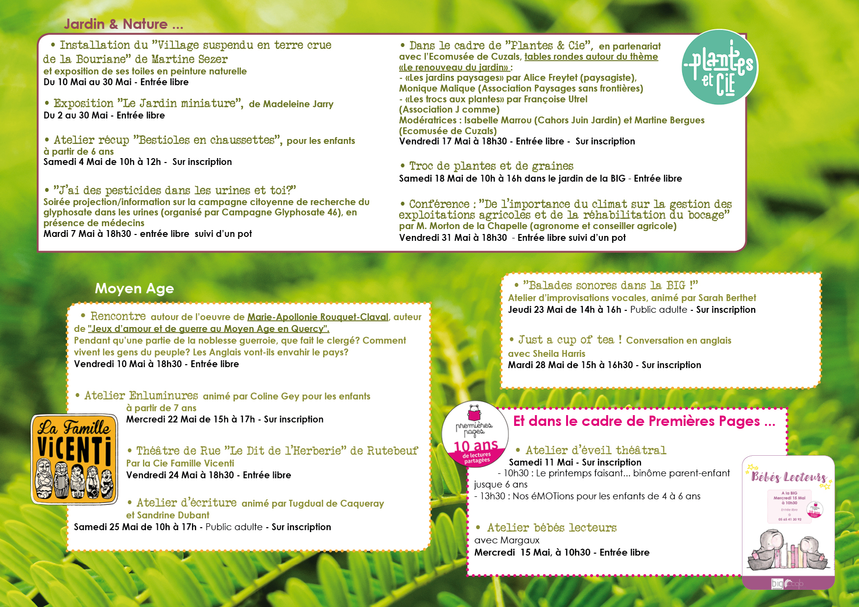 Programme du mois de mai de la Bibliothèque de Gourdon Publié le samedi, 27 avril 2019samedi, 27 avril 2019 par Bibliothèque Intercommunale Gourdon Durant le mois de mai, la bibliothèque de Gourdon vous propose des animations autour des thèmes » jardin & nature » et » Moyen Âge » avec ateliers, conférence, expositions, débat, troc de plantes, théâtre…