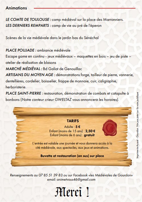 Programme Publié le mardi, 25 juillet 2023 par Anim'et Vous Disponible à l’office de tourisme et qui sera remis en caisse le 6 et 7 Août