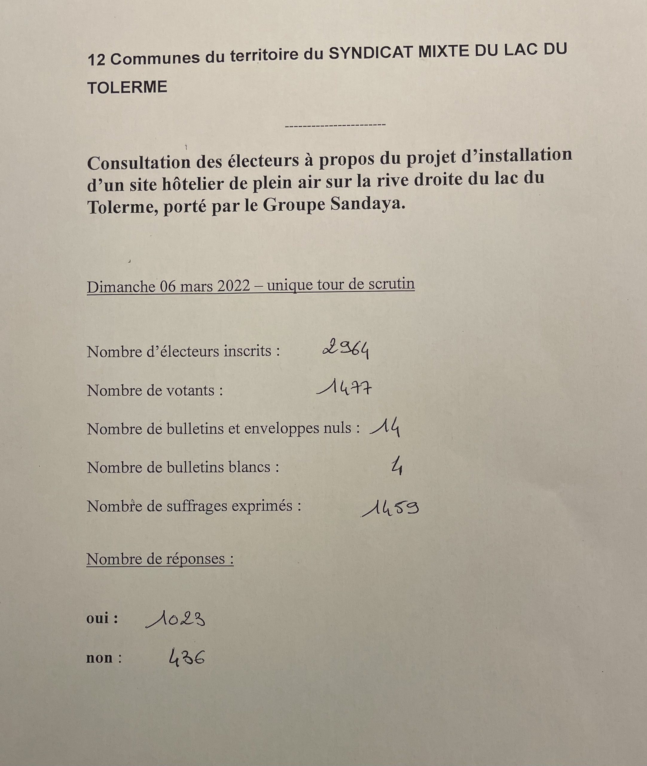 La consultation inédite, organisée par le Grand Figeac et le SYMLAT, des électeurs du Haut-Ségala sur le projet d’hôtellerie de plein air du groupe Sandaya au Lac du Tolerme, a livré son verdict ce 6 mars. Le « Pour l’a largement emporté.