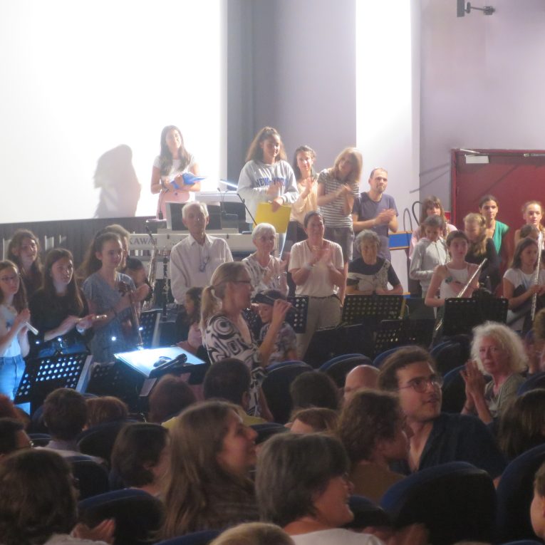 Ce vendredi 9 juin s’est tenue une séance de cinéma très spéciale à l’Atalante de Gourdon. A 19h30, la salle de projection était bruyante, fébrile et pleine comme un œuf. Devant un parterre de deux cents personnes plongées dans l’obscurité, une bonne quarantaine d’artistes de tous âges ont présenté une sélection d’extraits de films sur fond de morceaux de musique ou de chansons synchrones interprétés en direct. Ce projet préparé de longue date est le fruit d’une collaboration entre l’option cinéma du Lycée Léo Ferré, en particulier les élèves de seconde, et l’école de musique municipale « Catherine Schollaert », le tout orchestrée par Rémi Valléjo et Simona Bordes. D’énigmatiques dessins graphiques sur le thème musical de la Panthère rose à la très belle et émouvante interprétation des Moulins de mon cœur par une jeune lycéenne de dix-sept ans, de la musique de Games of Trones et ses images d’aventure aux extraits des films de Charlie Chaplin, accompagnées d’un chœur d’enfants, ou à quelques mythiques scènes d’Il était une fois dans l’Ouest superbement jouées par tout l’orchestre, la salle est passée de l’étonnement à l’émerveillement, du rire aux quasi larmes.