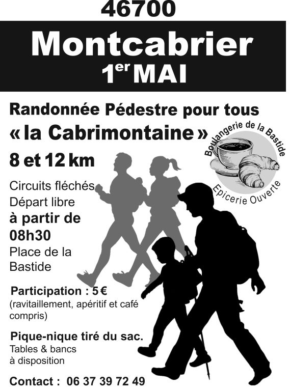 L’association Sports et Loisirs de Montcabrier vous propose un nouveau circuit fléché pour le 1 mai 2023 sur des chemins connus et moins bien connus de la commune. Le circuit principal est de 12 kilomètres avec la possibilité d’une version raccourcie de 8 kilomètres. Inscription sur place : 5 euros (ravitaillement, apéritif et café compris). Départ libre à partir de 08h30, Place de la Bastide, 46700 Montcabrier. Pique-nique tiré du sac (tables et bancs à disposition).
