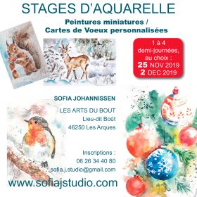 De nouveaux stages de peinture sont proposés aux Arts du Bout (lieu-dit Bout, 46250 Les Arques) avant les fêtes. Cette fois, les participant pourront essayer les techniques des peintures miniatures à l’aquarelle, et pourquoi ne pas ainsi créer leurs cartes de voeux personnalisées. L’aquarelliste Sofia Johannissen en réalise elle-même pour les fêtes, et partagera ses idées et son matériel (peinture, colle, paillettes…) lors de deux journées consacrées à ce thème (Lundi 25 novembre et lundi 2 décembre 2019). Les participants, débutants ou peintres plus expérimentés, peuvent s’inscrire pour le nombre de demie-journées de leur choix. Pour plus d’informations, rendez-vous sur www.sofiajstudio.com/stages ou appelez le 06 26 34 40 80.