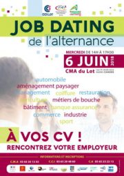 Job Dating de l’alternance à l’école des métiers du Lot le mercredi 6 juin. Il se déroulera de 14 h à 17 h 30. Le 7ème Job Dating de l’alternance organisé par les 3 chambres consulaires – Chambre de métiers et de l’artisanat, Chambre de commerce et d’industrie, Chambre de l’agriculture – se tiendra à l’école des métiers du Lot, rue Saint-Ambroise, à Cahors, le mercredi 6 juin, de 14 h à 17 h 30. Formidable outil de promotion de l’alternance à l’échelle du département, il permet aux entreprises de recruter, en contrat d’apprentissage ou de professionnalisation, et aux candidats de trouver l’entreprise qui convient à leur projet. Ces derniers rencontrent plusieurs entreprises en quelques heures, bénéficient de l’accompagnement des conseillers consulaires pour trouver la bonne formation mais aussi pour la rédaction de leurs CV, la préparation des entretiens…