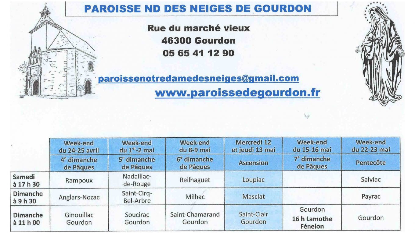 dimanche 9 mai : messe à Milhac à 9h30 – messe à 11h à Saint Chamarand et Gourdon