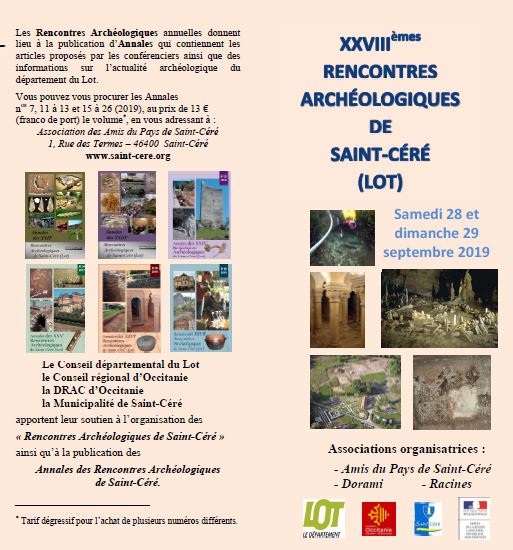 Rencontres Archéologiques de Saint-Céré : 28 et 29 septembre Publié le mercredi, 11 septembre 2019mercredi, 11 septembre 2019 par jevouslis Le programme des conférences et visites