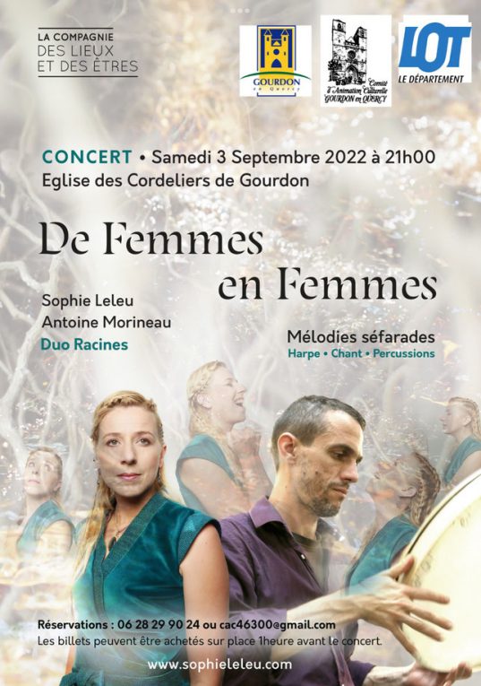 Samedi 3 septembre à 21h, Eglise des Cordeliers, le Comité d’Animation Culturelle de Gourdon vous présente la Compagnie des Lieux et des Etres à l’occasion d’un concert de mélodies séfarades « de Femmes en Femmes ».