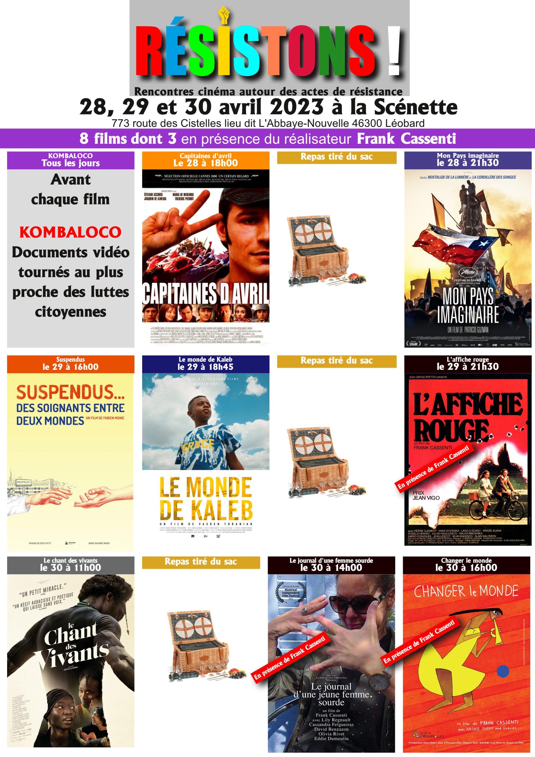 Voici le programme pour l’édition 2023 des Rencontres Cinématographiques et plus de RESISTONS ! ainsi que le lien pour la billetterie via hello-asso. Vous pourrez payer en euros mais aussi réserver vos places en utilisant le billet « GRATUIT » et payer sur place en Céous avec une réduction. RESISTONS ! ça passe par là aussi.