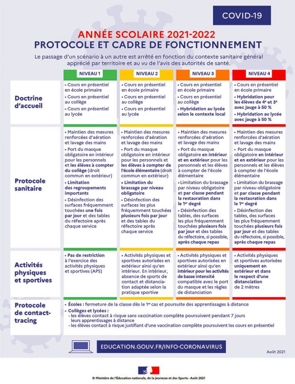 Un protocole sanitaire et un cadre de fonctionnement ont été définis pour l’année scolaire 2021-2022 pour faire face aux évolutions de l’épidémie de Covid-19 et à une éventuelle dégradation de la situation sanitaire. Quatre scénarios ont été établis en fonction de la gravité de la crise sanitaire :