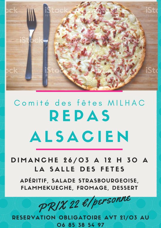 Le Comité des fêtes de MILHAC vous propose un repas ALSACIEN le dimanche 26 mars 2023 à 12 h 30 à la salle des fêtes.