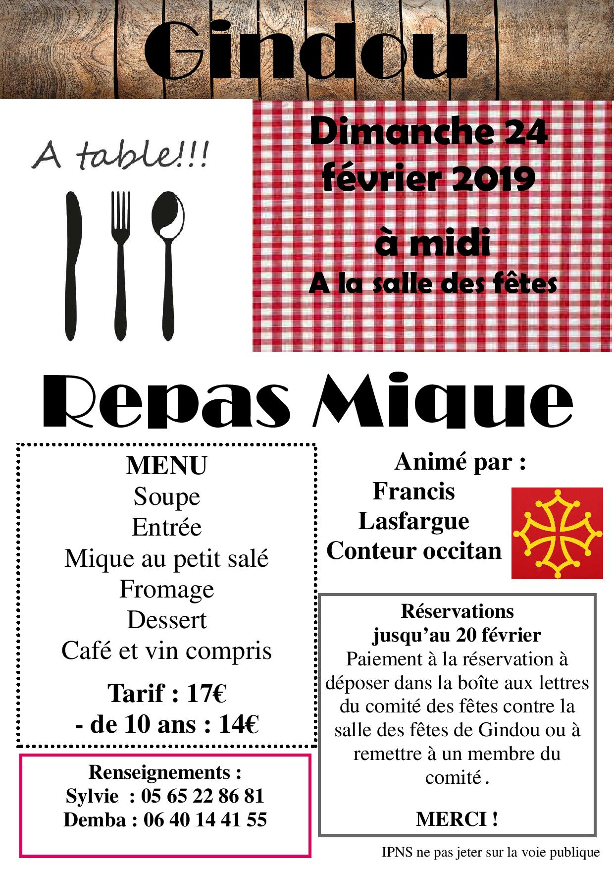 Mique à Gindou le 24 février. Il reste encore quelques places : n’oubliez pas de réserver (05.65.22.86.81 ou 06.40.14.41.55).