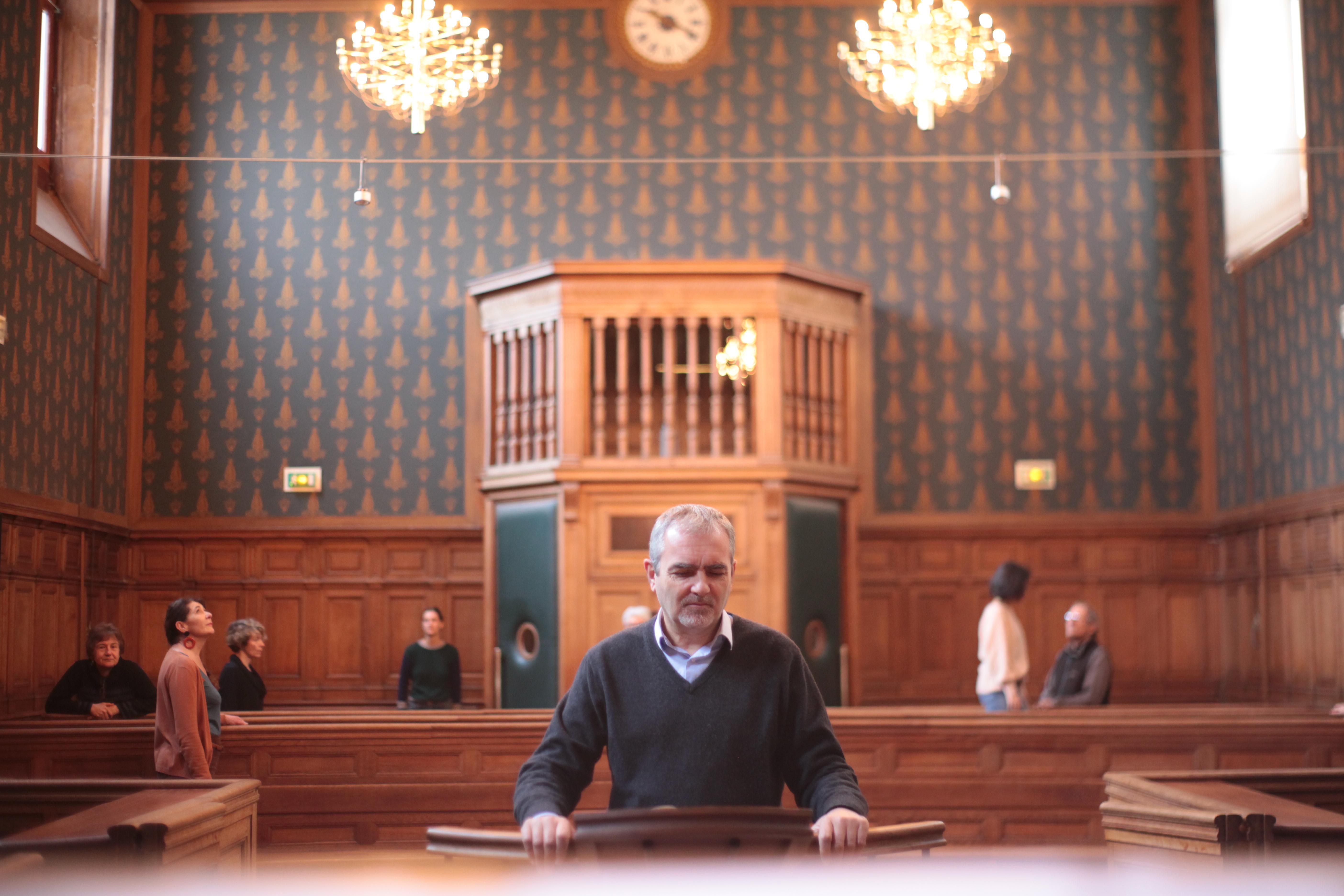 Les représentations se dérouleront en salle de la cour d’assises « Simone Vieil ». Les spectateurs seront assis à la place des magistrats. Quant aux acteurs/lecteurs, en attente sur les bancs habituellement réservés au public, ils se lèveront tour à tour pour prendre la parole à la barre, sur laquelle repose le livre « Témoignage » de Charles Reznikoff. Le juge, joué par un comédien, donnera un numéro, une page à lire… telle une injonction, renforçant ainsi le caractère anonyme et potentiellement infini de ces histoires.
