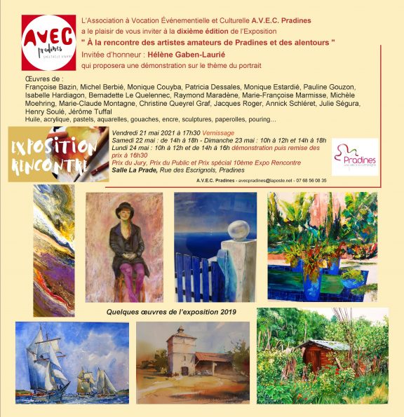 L’invitée d’honneur Hélène Gaben-Laurié, artiste pastelliste aux portraits étonnants de réalisme et de délicatesse, proposera une démonstration sur le thème du portrait, le lundi à 14h. L’Exposition Rencontre, qui se tient pour la première fois à La Prade, sera ouverte le samedi 22 mai de 14h à 18h, le dimanche 23 mai de 10h à 12h et 14h à 18h puis le lundi 24 mai de 10h à 12h et de 14h à 16h (Entrée libre).