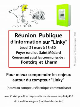 Suite à la réunion d’information sur les compteurs Linky, le 1 mars aux Junies, les habitants de Pontcirq, Lherm et Saint-Médard ont souhaité une nouvelle réunion qui aura lieu jeudi 21 mars à 18h 30 au Foyer Rural de St- Médard.