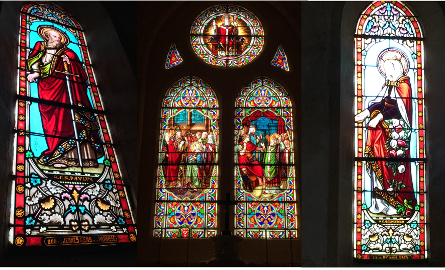 A noter une première particularité, qui a du sens à cette époque… Les vitraux qui représentent des Saints (hommes) sont exposés côté Sud de la Nef tandis que ceux représentant les Saintes (femmes) le sont sur le côté Nord. Ceci permettait très probablement de bien différencier les places des hommes et des femmes dans l’église…