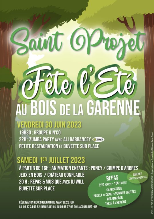 Bonjour à tous👋 on est de retour pour SAINT PROJET FÊTE L’ÉTÉ AU BOIS DE LA GARENNE 2ième Édition. C’est année on commence dès le vendredi 30 juin au soir avec le groupe K.n’Co à 19 h30 🎵🎤🎹🎶suivi à 22 h Zumba Party avec Ali Barbancey-Rivas. Le Samedi 1er juillet à partir de 16 h animations enfants.Repas et soirée avec Djwill Murat 🥳🎉🥳Alors on vous attend venez nombreux!!! Ça va être le 🔥🔥!Pensez à réserver pour le repas les inscriptions sont ouvertes.