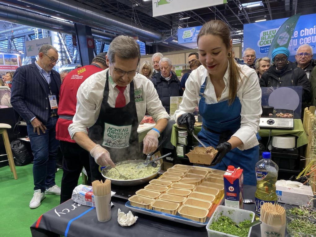 Dans le Hall 1 du salon de l’agriculture 2023, le stand « Causses du Lot » a fêté ce 28 février en avant-première les 40 ans du label Agneau Fermier du Quercy. Pour l’occasion, Laurent Flaujac, boucher sous les halles de Cahors a réalisé une démonstration de découpe de carcasse qui a impressionné les visiteurs. Les morceaux ont été ensuite sublimés par Nastasia Lyard (www.instagram.com/nastasialyard_topchef) pour une dégustation exceptionnelle. Cette journée d’anniversaire ne pouvait pas mieux se conclure : 2 médailles ont été obtenues par l’Agneau Fermier du Quercy des établissements Destrel/Bigard de Gramat : une en or, une en bronze ! Côté concours, Jean-Marc Gardes, éleveur à Saint-Cirgues a réussi l’exploit de damer le pion aux élevages de l’ouest sur la race Prim’Holstein. Il a obtenu le premier prix avec sa vache Opérette ! Enfin, Carole Delga, présidente de la Région Occitanie, et la délégation régionale ainsi que Guillaume Gomez, ancien chef de l’Elysée, sont passés et ont fait l’honneur au stand lotois.
