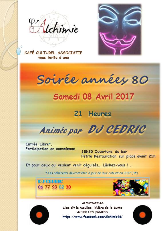 Samedi 08 Avril à 21H00 soirée années 80 animée par DJ CEDRIC à l’Alchimie des JUNIES