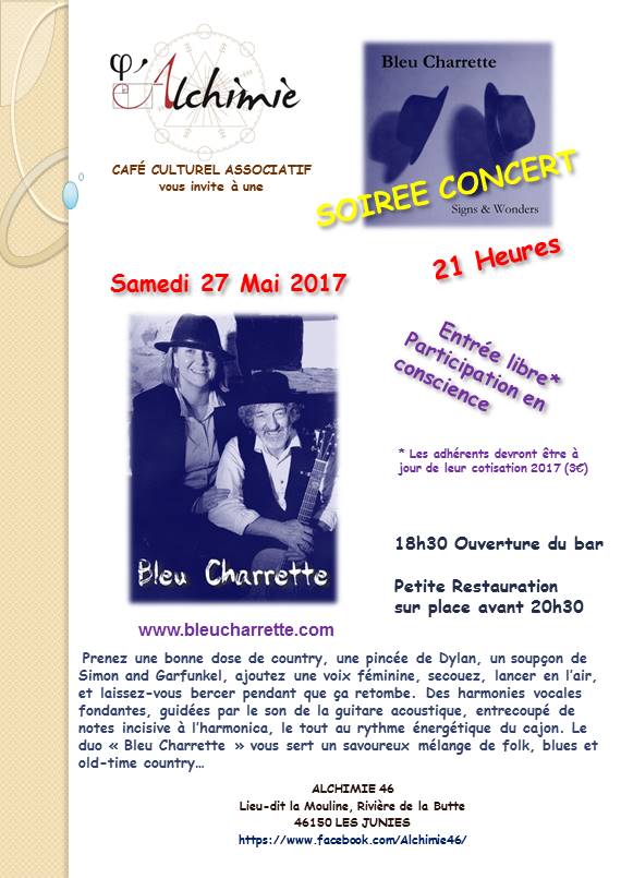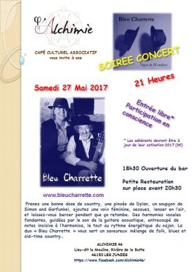 Samedi 27 Mai Concert de Bleu Charette à l’Alchimie