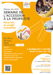 Du 20 au 24 mars 2023, le réseau des ADIL se mobilise pour aider les futurs propriétaires à préparer et à sécuriser leur projet d’achat immobilier. Tout au long de cette semaine, votre ADIL 46 organise différentes actions ouvertes sur leur département.