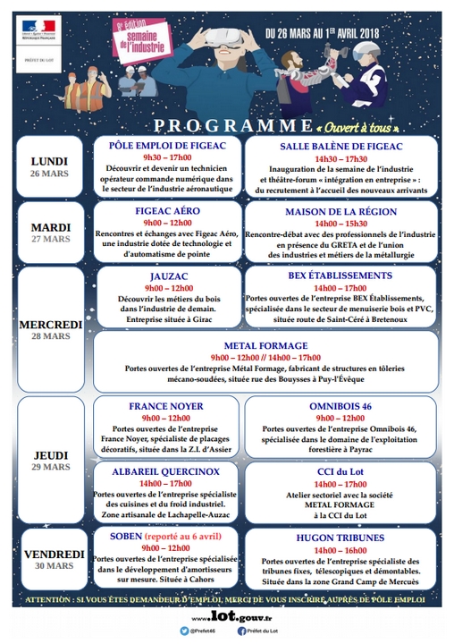 Dans le Lot, 34 événements sont organisés : rencontres et échanges avec Figeac Aéro ; rencontre débat avec des professionnels de l’industrie à la Maison de la Région ; découverte des métiers du bois chez Jauzac Entreprise à Girac ; portes ouvertes de Métal Formage à Puy-l’Evêque, de France Noyer à Assier, d’Omnibois 46 à Payrac, d’Albareil Quercinox à Lachapelle-Auzac, d’Hugon Tribunes à Mercuès ; atelier sectoriel à la CCI avec Métal Formage.