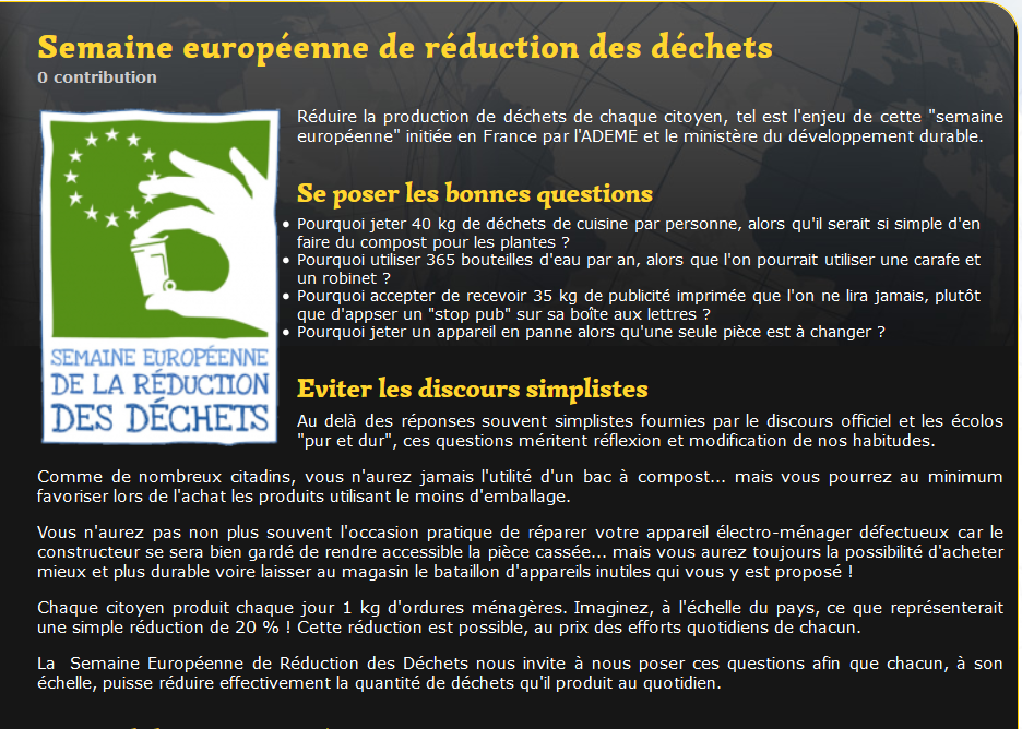 La Semaine Européenne de la Réduction des Déchets du 19 au 27 novembre.