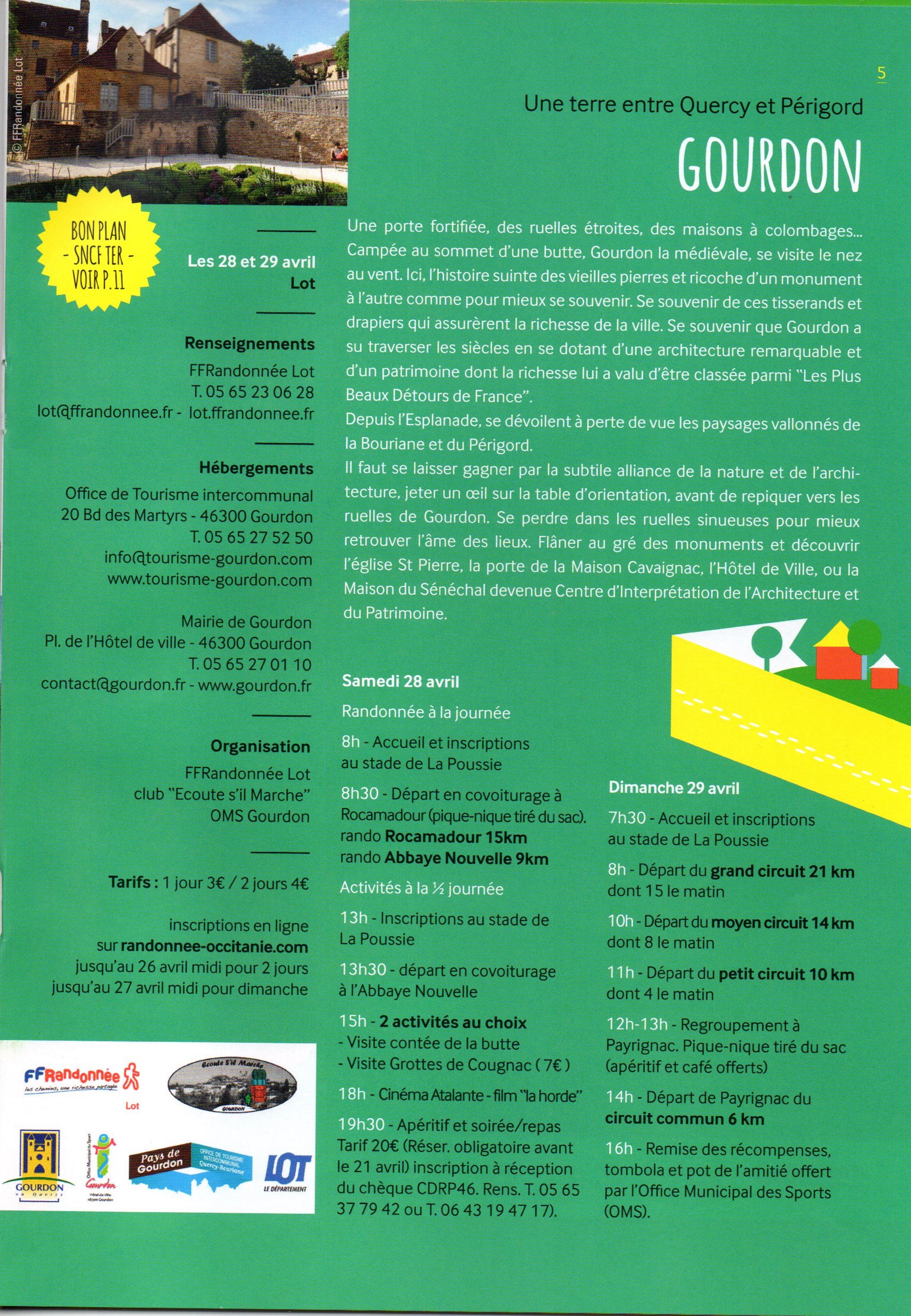 .Le club de randonnée pédestre de Gourdon « Ecoute s’il marche » organise sous l’égide de la Fédération Française de randonnée d’Occitanie la « Rando Occitane » les 28 et 29 avril 2018. Cette manifestation ouverte à tous invitent les marcheurs à la découverte du terroir et de ses richesses patrimoniales dans un esprit de convivialité. Les différents itinéraires prennent en compte le rythme et le niveau de chacun. Au programme Rocamadour, L’Abbaye Nouvelle, Gourdon, Payrignac, etc.