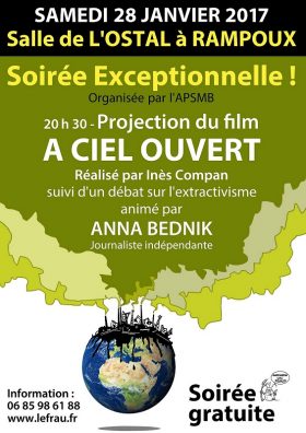 20h30 Samedi 28 janvier 2017, salle de l’Ostal à Rampoux, Soirée exceptionnelle avec la Projection du film « A CIEL OUVERT » réalisé par Iñès COMPAN