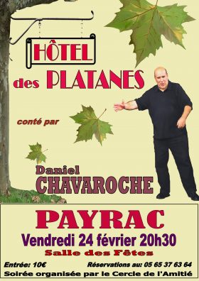 Vous voulez passer un bon moment, oublier vos soucis pour une soirée, venez rire à la Salle des Fêtes de Payrac, le vendredi 24 Février à 20h30 où Mr Chavaroche viendra Conter « L’Hôtel des Platanes » Cette soirée est organisée par le Cercle de l’Amitié Payrac Loupiac Lamothe. Des pâtisseries seront offertes à la fin du spectacle.