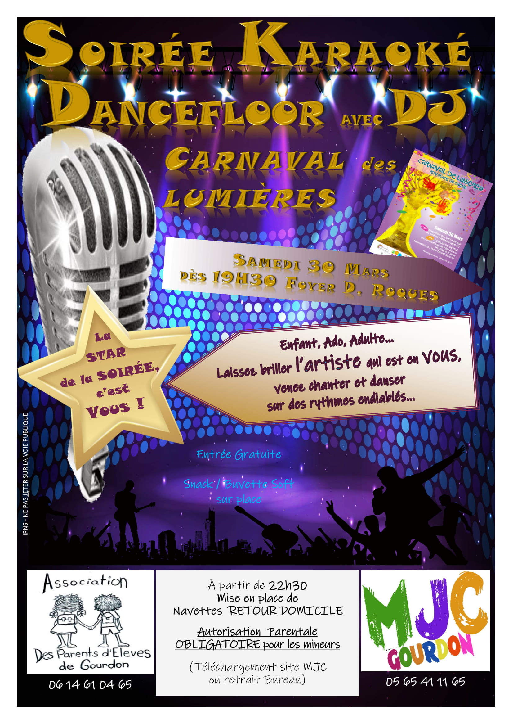 Karaoké suivi d’une soirée dancefloor avec DJ SCUM, co-organisé avec l’APE de Gourdon.
