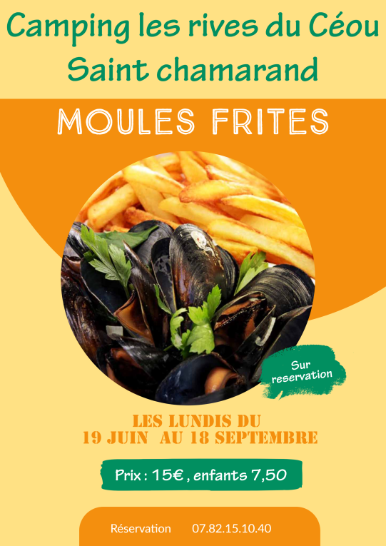 La dynamique et sympathique équipe du camping de Saint Chamarand, vous accueille, les lundis à partir du 19 juin pour ses soirées moules frites et dessert maison .Pensez à reserver au 07.82.15.10.40
