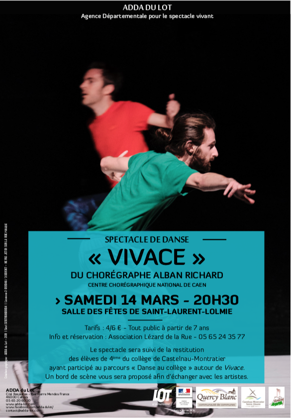 Pour la 10ème année, l’ADDA et la communauté de communes du Quercy Blanc s’associent afin de développer un projet culturel de territoire alliant danse et musique. Cette année des actions se sont développées autour du spectacle Vivace d’Alban Richard. Chorégraphe et directeur du Centre Chorégraphique National de Caen en Normandie, son écriture chorégraphique repose sur un rapport étroit avec une œuvre musicale puisée dans un répertoire étendu. La partition musicale insuffle structures et formes à la danse.