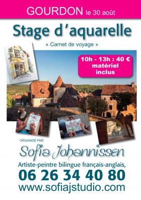 Le prochain stage animé par Sofia Johannissen aura lieu dans la cité médiévale de Gourdon, le vendredi 30 août de 10h à 13h. Les participants pourront déambuler dans les ruelles en créant un petit « carnet de voyage », ou s’installer à un endroit paisible pour peindre le motif de leur choix. Un moment de partage convivial, pour découvrir la cité à travers des yeux d’artiste… Ce stage est adapté à tous les niveaux – débutants comme plus expérimentés, à partir de 12 ans.