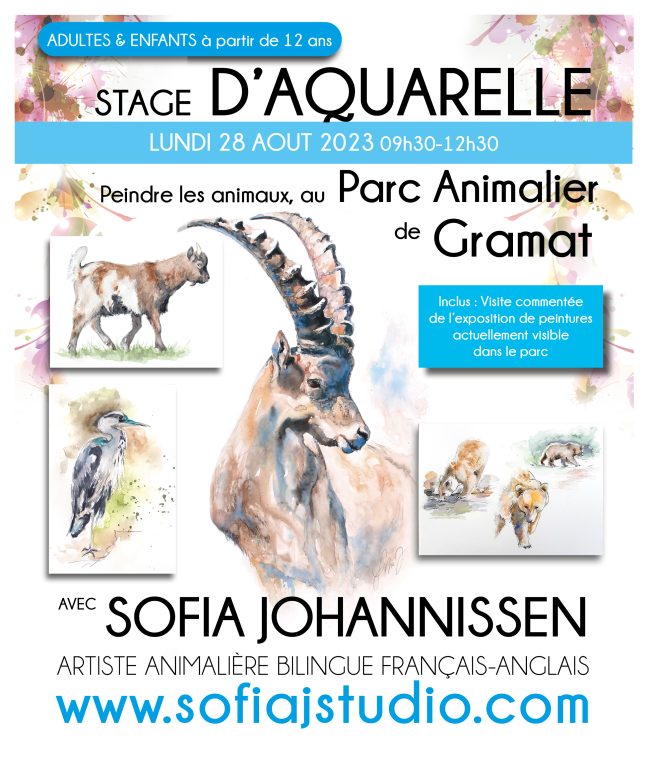 Le Parc animalier de Gramat ne cesse d’évoluer ! Cette année, ils ont notamment ouvert un nouvel enclos d’immersion. Sofia Johannissen, artiste animalier bilingue et également illustratrice pour le parc, vous donne rendez-vous le 28 août 2023 de 9h30 à 12h30, pour peindre dans ce lieu paisible et inspirant, tant par ses pensionnaires que par sa nature ! A l’aide de photos fournies de certains animaux du parc, ET en observation sur le vif, vous pourrez créer votre « carnet de voyage », ou vous concentrer sur un animal en particulier et réaliser son portrait ! L’artiste vous propose de vous concentrer autour des loups, les ours, la volière d’immersion (où l’on marche en plein milieu des faisans, ibis, et autre paons blancs… ), et La Ménagerie des Petits (avec les chèvres naines, ânes miniatures, oies frisées, canards de Barbarie, etc..) mais les autres espèces ne seront pas délaissées pour autant !