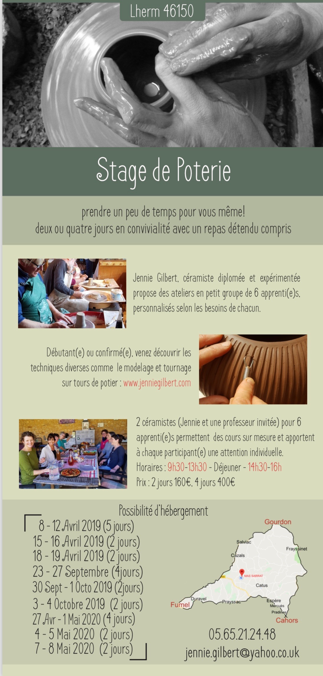 Jennie vous propose des stages de poterie sur 2, 4 ou 5 jours dans son atelier à Lherm pendant le mois d’Avril. 2 céramistes (bilingues) pour 6 apprenti(e)s permet des cours sur mesure et apportent a chaque participant(e) une attention individuelle.Contactez Jennie au: 0565212448 ou par e-mail: jennie.gilbert@yahoo.co.uk