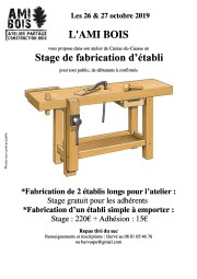 Soit vous êtes adhérent, vous souhaitez apprendre de nouvelles techniques et participez à la réalisation des 2 établis de l’atelier, et le stage est gratuit.
