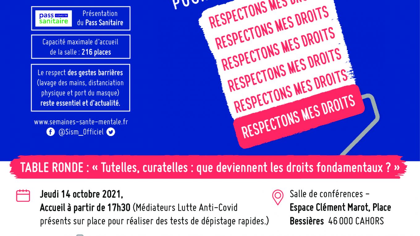 Dans le cadre des Semaines d’Information sur la Santé Mentale, l’UNAFAM du Lot s’est associée à des partenaires (UDAF, APF France handicap, Alisé, PTA 46, ADMR, IREPS, MGEN) pour proposer cette table ronde (sur la base du rapport de M. PRADIE Aurélien sur les droits fondamentaux des personnes sous tutelles, curatelles).