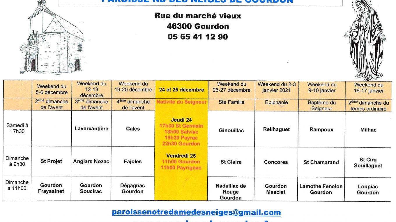 Les messes ont pu reprendre dans les églises, et s’il existe toujours quelques contraintes liées à la crise sanitaire, nous pourrons fêter la Nativité dignement… Comme le nombre de personnes présentes ne doit pas être trop important, nos prêtres se sont efforcés de multiplier les lieux et horaires de messes. Voir le tableau si dessus.