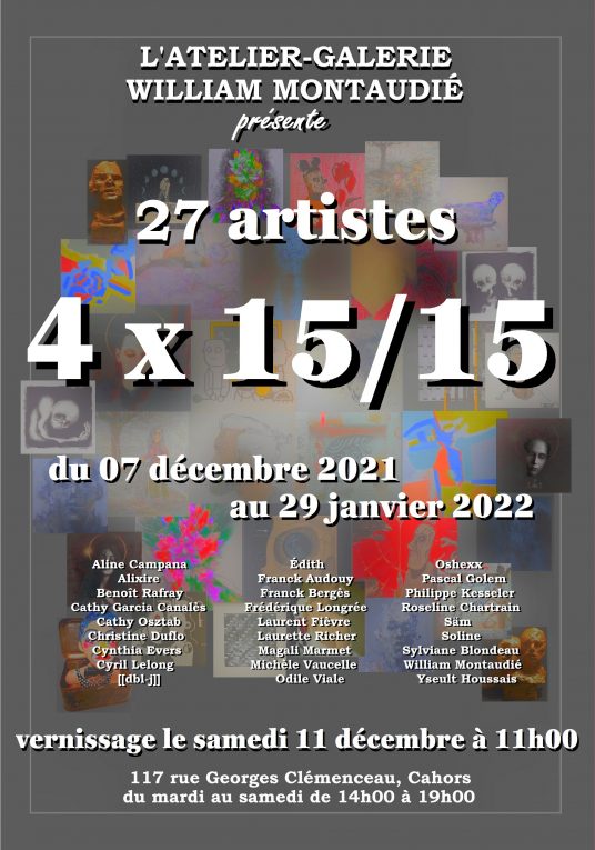Continuer la lectureBonjour Nous vous informons que l’exposition ‘4×15/15’ durera jusqu’au samedi 29 janvier. Elle présente le travail de 27 artistes venus