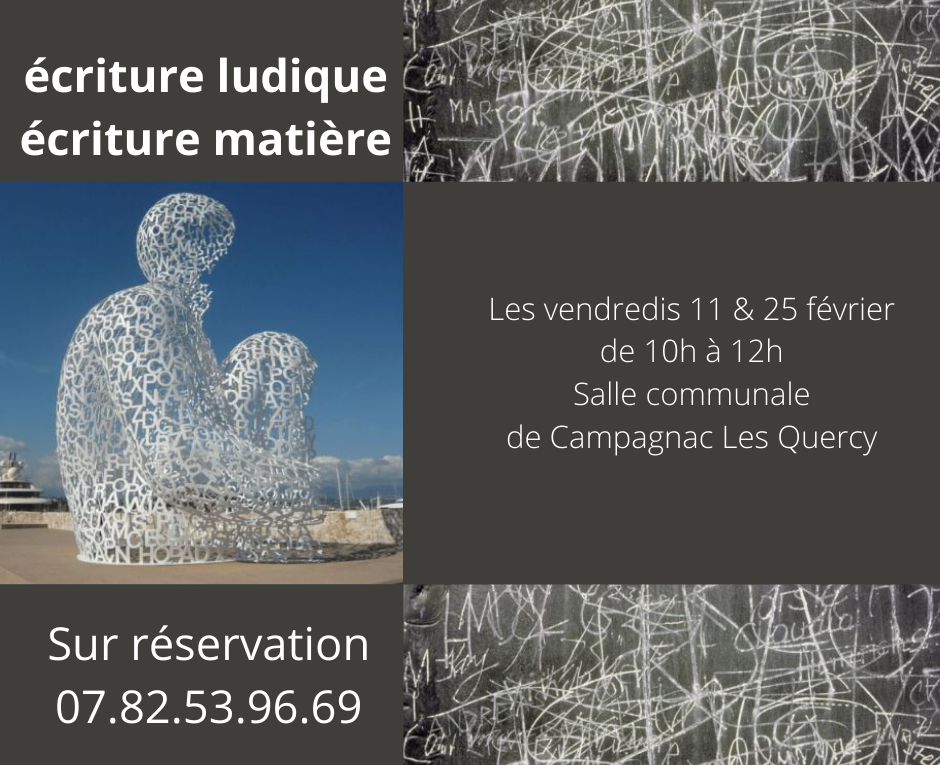 Continuer la lectureLes Moissonneurs de rêves vous proposent « un atelier d’écriture – matière » à Campagnac Les Quercy Salle communale (face