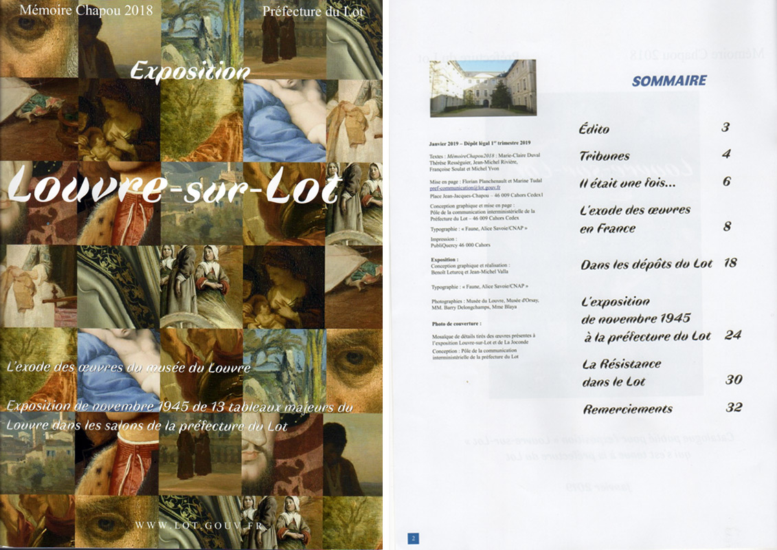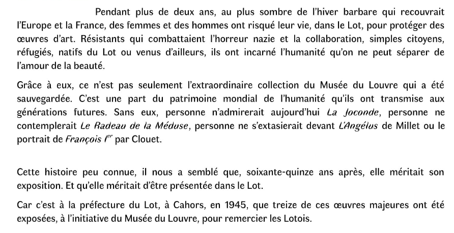 Une exposition commémorant celle qui, en novembre 1945, avait réuni, dans les salons de la préfecture treize tableaux majeurs du Musée du Louvre dont le portrait de François Ier par Clouet, l’Angélus de Millet, deux toiles de Watteau (l’Indifférent et la Finette) mais aussi des œuvres de Rembrandt, Raphaël, Le Tintoret, Le Nain, Rubens, Cézanne, Chardin, ou encore Corot. Cette exposition, initiée grâce à Jean Lurçat et aux réseaux lotois de la Résistance, avait accueilli plus de 3 000 visiteurs.