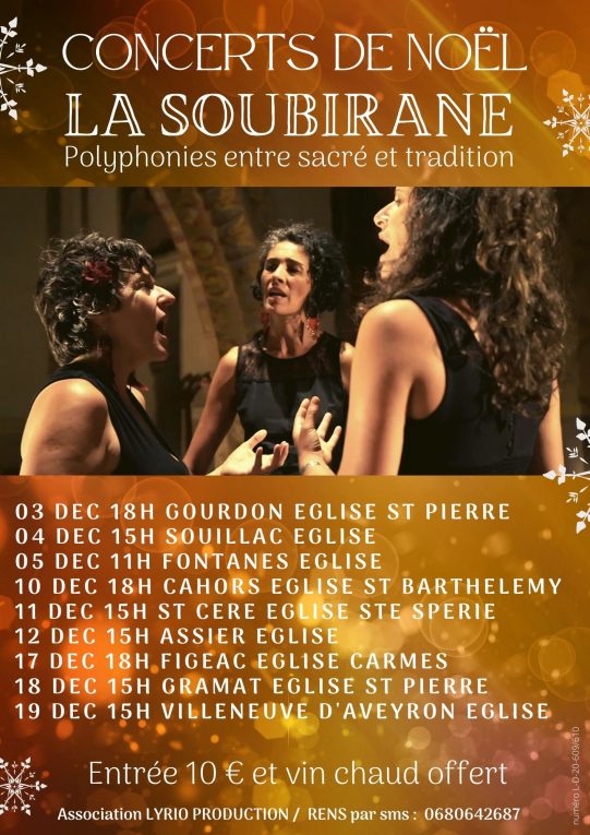 Le trio vocal féminin La Soubirane se produit dans les églises du Lot les Vendredis, Samedis et Dimanches, pour égailler vos veillées du mois de Décembre.