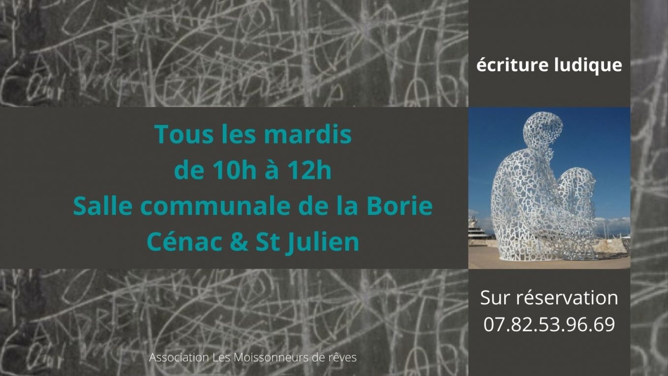 l’association des Moissonneurs de rêves vous propose un Atelier d’écriture ludique où vous pourrez laisser vagabonder votre imaginaire, accueillir ce qui se présente à vous, dans un cadre ludique et sécurisé, en toute bienveillance et sans aucun jugement, ni de soi, ni des autres. Nul besoin d’être expérimenté, aucun prérequis ni aucune technicité ne sont souhaités, il s’agit juste être dans le plaisir de l’instant, de sa propre connexion à soi et au monde.