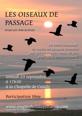 Au début de l’automne voici des oiseaux qui nous visitent. A la fin d’une semaine de chant et d’amitiés nouvelles nos visiteurs vont nous donner un concert de belles chansons de toutes les époques juste pour notre enchantement. Et tout sera dirigé par Anke de Bruijn. Venez écouter à la chapelle de Cazals. Entrée par chapeau.
